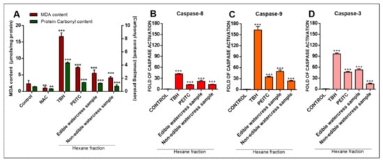 The effect of edible and non-edible watercress samples on lipid and protein oxidation levels in human malignant melanoma (A375) cells. (A) Lipid and protein oxidation levels (MDA and carbonyl contents, respectively) were determined upon treatment of A375 cells with either 2.5 mM N-acetyl cysteine (NAC; negative control),200 μΜ tert-butyl hydroperoxide (TBH; positive control), 10μM synthetic PEITC or 1.3% (v/v) edible or 2.5% (v/v) non-edible watercress samples, for 48 h of exposure. On the other hand, caspases−8 (B), −9 (C) and −3 (D) activities were determined in A375 cells following exposure to 1.3% (v/v) edible or 2.5% (v/v) non-edible watercress samples for 48 h. As positive control, 200 μM of TBH was used. Data shown are means ± SEM of and are representative of three independent experiments. Asterisks (**) denote statistical significance when compared to their respective control at p < 0.01 whereas *** denote statistical significance at p < 0.001.