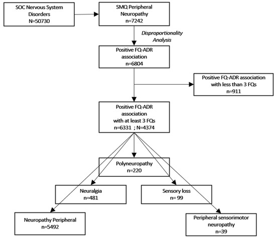 Data retrieved from the clinical development of a new drug is oftentimes insufficient to assess its potential toxicity when used in real-world conditions. In turn, the post-marketing period becomes essential for consolidating drug safety profiles and detecting previously unknown ADRs [25,26]. Of great scientific value, spontaneous reporting systems (SRSs) can provide information about new drug-related adverse effects and even generate early signals. Analyzing such databases plays a primary role among pharmacovigilance (PV) methods [25]. To the extent of our knowledge, this is the first study aiming to evaluate FQ-induced peripheral nervous system disorders in VigiBase, the global database of spontaneous reports. A similar study was performed in the FDA Adverse Event Reporting System (FAERS) by Ali et al., evaluating potential quinolone-induced peripheral neuropathies reported up to 2012 [1]. The present evaluation of FQ-induced peripheral nervous disability in VigiBase tends to re-emphasize the link between FQs and PN, including post-referral PV data. Similar to all SRS databases, VigiBase encompasses advantages like continuous data collection and broad population coverage [27], thus representing one of the most valuable sources of PV data.