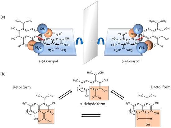 Gossypol is a complex polyphenolic compound naturally occurring in the glands, leaves, stems, roots, and seeds of cotton plants with the highest concentration in the seeds [1,2]. Gossypol is a strongly colored yellow, crystalline pigment, which is almost insoluble in water and hexane and, in contrast, soluble in acetone, chloroform, ether, and methyl ethyl ketone (butanone). It is also partially soluble in crude vegetable oils. The chemical formula is C30H30O8 and the systematic name is 2,2′-bis (formyl-1,6,7-trihydroxy-5-isopropanyl-3-methylnaphthalene) [2,3]. Due to the restricted rotation of the two naphthyl rings around the interlinking C–C bond, gossypol exhibits atropisomerism (Figure 1) [4].