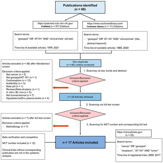 In addition to literature research in the PubMed, MEDLINE, and Cochrane databases, the ClinicalTrials.gov, a resource provided by the U.S. National Library of Medicine, was screened for registered studies, testing gossypol/AT-101 as a potential anticancer agent. Therefore, the search terms “gossypol”/“AT-101”, and “cancer” or “tumor” were entered to identify the relevant investigations. From 2005–2015, a total of 23 clinical trials were included in the database. In some articles ClinicalTrials.gov identifiers/NCT numbers were missing and other relevant information on dosing regimen or details on toxicities were included in the narrative description or also for comparison of the studies of the current systematic review. As the focus of the review was on outcomes, studies with “has results” status were examined in detail. After determining searching criteria, seven of 23 trials were defined to own the results and four from seven were already described and published as an original work. The remaining three studies were explicitly proven for outcome.