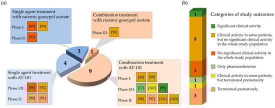 Graphical representation of the results of reviewed studies in cancer clinical trials analyzing the administration of gossypol/AT-101 as a single agent or in combination with standard anticancer treatments. The pie chart is stratified according to study design (a) and outcome (b). (a) The diagram illustrates the total number of conducted clinical trials as a circle. The numbers in the four sections correspond to the number of studies performed in each case. The light blue sections represent the proportion of studies performed with gossypol/AT-101 as single agent, light orange sections represent the proportion of combined therapies (gossypol/AT-101 and standard anticancer protocols). Each section is further subdivided by study phase and contains colored boxes with the corresponding references in brackets. Each color represents one of the study outcomes defined in (b). (b) The bar divides the study outcomes into six categories. Each of the six different categories contains the number of studies performed and is color-coded according to the study outcome.