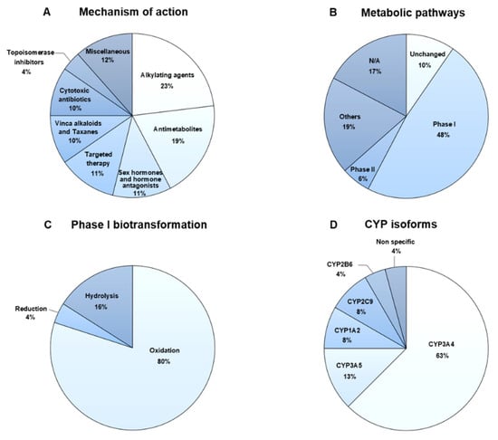 Characteristics of anticancer drugs: (A) mechanism of action; (B) metabolic pathways; (C) phase I biotransformation; and (D) cytochrome P450 (CYP) isoforms responsible for metabolism.