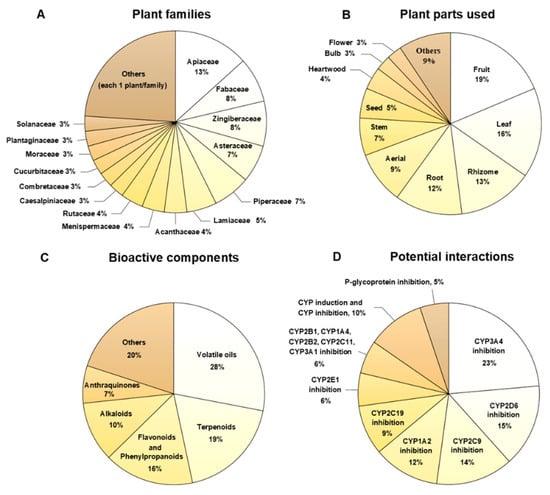 Characteristics of Thai herbs: (A) plant families; (B) plant parts used; (C) bioactive components; and (D) potential interactions. Most herbs could inhibit cytochrome P450 (CYP) isoforms and P-glycoprotein; 10% of herbs could inhibit one or more CYP isoform, while inducing other CYP isoforms.