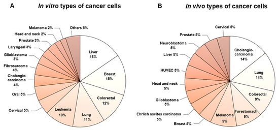 Interestingly, many Thai herbs in our study exhibit anticancer activities (Table S3). More than of the half (39 out of 75) have been reported to show cytotoxic effects against cancer cell lines or in in vivo models. The most common cell types used in in vitro studies have been liver (16%), breast (15%) and colorectal (12%) (Figure 3A), whereas only 16 herbs (21%) have shown anticancer activity in in vivo studies. The most reported cell types have been cholangiocarcinoma (14%), lung (14%) and colorectal (9%) (Figure 3B).