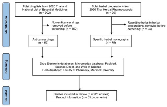 We collected pharmacokinetic, pharmacodynamic, toxicological, and drug interaction data of anticancer drugs by using the Micromedex database, which we accessed under the copyright license of Chulalongkorn University (2020). If the drug data were not available in the database, we used PubMed, Science Direct, and Web of Science to find information on metabolic pathways and drug interactions. For the pharmacologic information on Thai herbs, we used the herb database from the Faculty of Pharmacy, Mahidol University, Thailand, and also available online databases (PubMed, Science Direct, and Web of Science). These data provide the pharmacodynamic activities and the possibility of drug–herb interactions. All data were gathered and analyzed from 1 January to 31 December 2020. The keywords for data collection were: