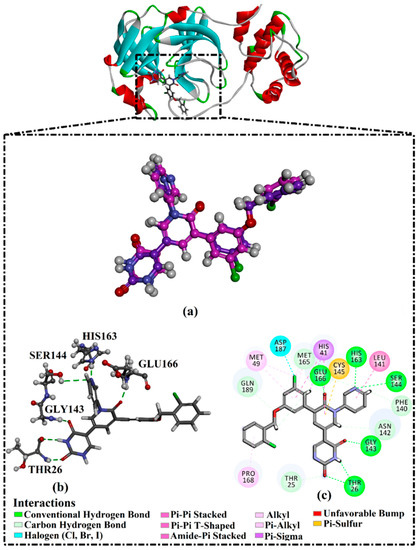 The performance of the utilized in silico protocol to predict the binding mode of SARS-CoV-2 Mpro inhibitor was evaluated. The co-crystallized (5S)-5-(3-{3-chloro-5-[(2-chlorophenyl)methoxy]phenyl2-oxo[2H-[1,3′-bipyridine]]-5-yl)pyrimidine-2,4(3H,5H)-dione (XF7) inhibitor was redocked against the SARS-CoV-2 Mpro, as well as the anticipated binding mode was compared to the experimental binding mode (PDB code: 7L13) [27]. As shown in Figure 1, the predicted binding mode was very similar to the resolved experimental binding mode with an RMSD of 0.20 Å and a binding affinity of −9.5 kcal/mol. This data comparison revealed the superior performance of AutoDock4.2.6 software in anticipating the experimental binding mode of Mpro inhibitors. The robust binding of XF7 with Mpro is attributed to the NH and two CO groups of pyrimidine-2,4(1H,3H)-dione ring to form hydrogen bonds with a backbone CO, NH group of THR26 and the backbone NH of GLY143 with bond lengths of 2.49, 2.28, and 2.07 Å, respectively (Figure 1). Besides, a nitrogen atom of pyridine rings interacts with the backbone CO group of SER144 and the imidazole ring of HIS163 with bond lengths of 3.29 and 1.91 Å, respectively (Figure 1). At the same time, the carbonyl group of pyridin-2(1H)-one ring exhibits a hydrogen bond with the backbone NH group of GLU166 with a bond length of 1.81 Å (Figure 1). Therefore, the docking protocol confirms the outperformance of this approach in identifying potent inhibitors as prospective SARS-CoV-2 Mpro inhibitors.