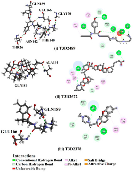 3D and 2D molecular interactions of the predicted docking poses of toxins (i) T3D2489, (ii) T3D2672, and (iii) T3D2378 towards SARS-CoV-2 Mpro.