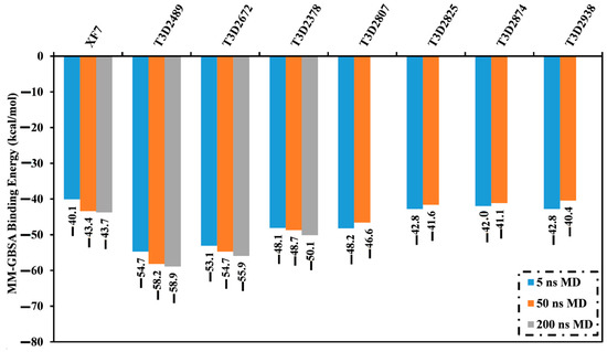 There is no noteworthy disparity between the computed MM-GBSA binding affinities throughout 50 ns and 200 ns MD simulations for T3D2489-, T3D2672-, and T3D2378-Mpro complexes (Figure 3). Compared to the binding energy of the co-crystallized XF7 (calc. −43.7 kcal/mol), T3D2489, T3D2672, and T3D2378 revealed a greater binding affinity against Mpro throughout the 200 ns MD simulations with an average ΔGbinding of −58.9, −55.9, and −50.1 kcal/mol, respectively.