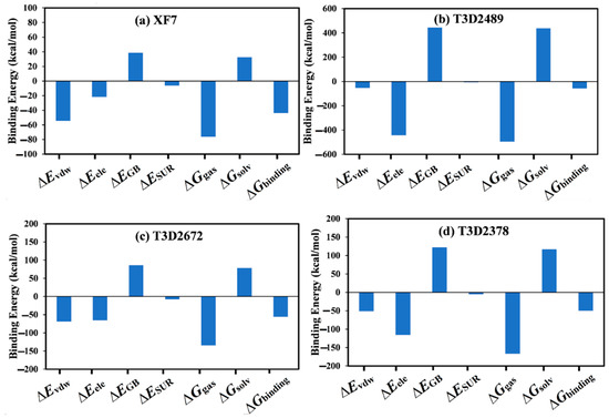 Components of the MM-GBSA binding energies for (a) XF7, (b) T3D2489, (c) T3D2672, and (d) T3D2378 complexed with SARS-CoV-2 Mpro throughout the simulation time of 200 ns.