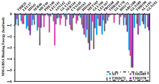 To more fully scrutinize enzyme-inhibitor interactions and the participation of proximal amino acids in the inhibitor-enzyme complexes, total ΔGbinding values were separated to individual residues with the assistance of an MM-GBSA approach (Figure 5); only residues with ΔGbinding values lower than −0.50 kcal/mol were considered. GLY143, HIS164, GLU166, and GLN189 interact with T3D2489, T3D2672, T3D2378, and XF7. GLN189 contributed to the total binding affinity significantly with values of −3.7, −4.7, −4.7, and −3.2 kcal/mol for T3D2489-, T3D2672-, T3D2378-, and XF7-Mpro complexes, respectively (Figure 5). GLU166 was the second-highest contributor to total binding free with values of −0.7, −3.1, −1.2, and −2.3 kcal/mol for T3D2489-, T3D2672-, T3D2378-, and XF7-Mpro complexes, respectively (Figure 5). It is worth mentioning that all investigated complexes have similar interaction patterns with key amino acid residues, which signifies a resemblance in the binding mode in these complexes.