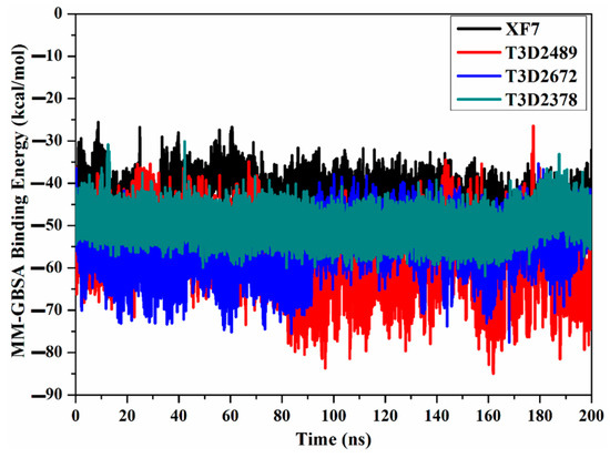 The structural steadiness of T3D2489, T3D2672, T3D2378, and XF7 complexed with Mpro was comprehensively evaluated over the 200 ns MD simulations via mensuration correlations between binding affinity and time (Figure 6). An interesting aspect of binding energy per frame was the overall stabilities for T3D2489, T3D2672, T3D2378, and XF7 with average ΔGbinding of −58.9, −55.9, −50.1, and −43.7 kcal/mol, respectively. Based on this analysis, all investigated systems preserved constancy over the 200 ns MD simulations.