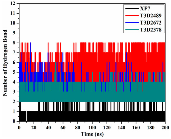 Hydrogen bond analysis was used to estimate the constancy of hydrogen bonding between identified toxins and Mpro throughout a 200 ns MD simulation. The number of hydrogen bonds per frame was evaluated and depicted in Figure 7. The number of hydrogen bonds oscillated throughout the 200 ns MD simulations, and the average number of hydrogen bonds was four, two, and two for T3D2489-, T3D2672-, and T3D2378-Mpro complexes. It is worth noting that XF7 showed the lowest number of hydrogen bonds with the proximal amino acids within Mpro’s binding pocket, while the outstanding binding affinity of XF7 with average ΔGbinding of −43.7 kcal/mol may be ascribed to other interactions like van der Waals and hydrophobic interactions. The dominance of van der Waals feature of interactions of XF7 with Mpro is in agreement with the MM-GBSA binding energies decomposition (Figure 4). The results obtained from the intermolecular bonds assured the presentence of a great stationary for the T3D2489, T3D2672, and T3D2378 complexed with Mpro compared to the XF7-Mpro complex.