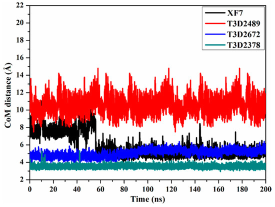 To obtain further in-depth insight into the steadiness of toxin-Mpro complexes throughout the 200 ns MD simulations, the center-of-mass (CoM) distance was estimated between the toxin and GLN189 (Figure 8). From the CoM graph, it is apparent that the measured CoM distance was more stable for T3D2672 and T3D2378 in complex with Mpro than T3D2489 and XF7 with average values of 5.1, 3.5, 10.2, and 5.6 Å, respectively. These findings demonstrate that the most identified toxins bind more tightly with the SARS-CoV-2 Mpro than XF7.