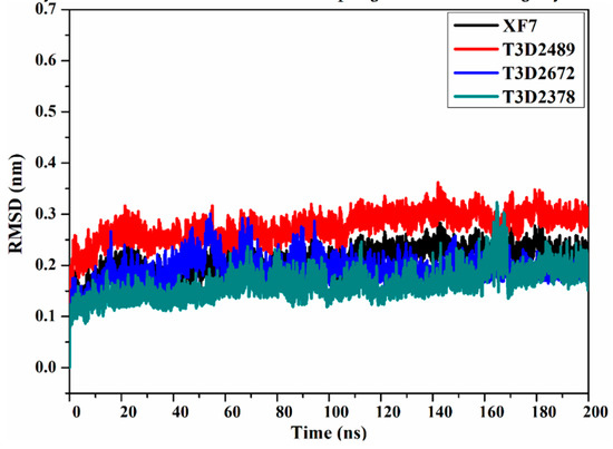 Root-mean-square deviation (RMSD) of the backbone atoms from the initial structure of XF7 (in black), T3D2489 (in red), T3D2672 (in blue), and T3D2378 (in cyan) with SARS-CoV-2 Mpro during the simulation time of 200 ns.