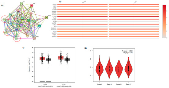 Bioinformatic analysis: (A) The PPI network of top genes; (B) the top 20 gene comparison in lung adenocarcinoma and lung squamous cell carcinoma; (C,D) Gene Expression Profiling Interactive Analysis (GEPIA), the expression level of CTSB was increased in lung adenocarcinoma and squamous cell lung carcinoma.