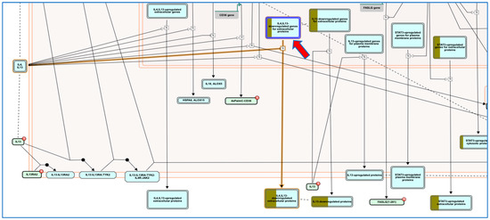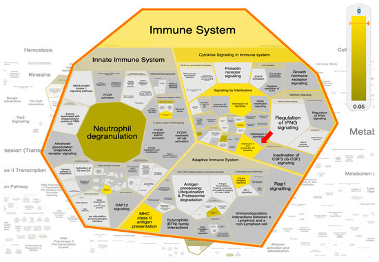For extensive and biological-wide mining of philanthotoxin (T3D2489) target-function interactions, a Reacfoam map was constructed based on PEA analysis and Reactome mining/modeling. The Reacfoam map tree was constructed to illustrate the top enriched pathways affected by 20 top gene targets in response to philanthotoxin (Figure 11). Moreover, an illustrative graphical map was built to show the top enriched pathway as a response to T3D2489 treatment (Figure 12). Prominently, the top enriched pathways involved: (1) signaling by the interleukin pathway, (2) interleukin-4 and interleukin-13 signaling pathway, and (3) immune system pathway. These pathways were determined to be the most significantly enriched pathways targeted by T3D2489 (Table S3).
