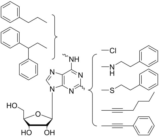 Starting from these observations, the purpose of this work was to identify new potential anticancer agents and to verify that the antitumor activity of these molecules is not closely associated with the A3AR binding affinity, confirming the possible intervention of other mechanisms. Hence, taking into account the structure of the two Ado derivatives 4 and 5, which showed cytotoxic activity in the three tumor cell lines mentioned above, in the present work, the synthesis of a new series of 2,N6 di-substituted Ado derivatives bearing the same substituents of 4 and 5 at the N6-position and a chlorine atom, different alkynyl chains and a phenethylthio group at the 2-position, was undertaken (Figure 2).