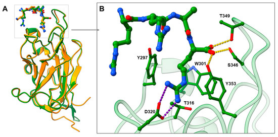 (A) Comparison of the binding modes of VEGF-A164 (in orange stick representation) and SARS-CoV-2 (in green stick representation) CendR motifs by superimposing VEGF-A-NRP1 (PDB ID: 4DEQ; [17] NRP1 in orange cartoon representation) and SARS-CoV-2-NRP1 (PDB ID: 7JJC; [6] NRP1 in green cartoon representation) complexes. (B) Zoomed view representing SARS-CoV-2 CendR binding mode into the b1 domain of NRP1, highlighting interactions with the key amino-acid residues (in green stick representation). Hydrogen bonding and salt bridge interactions are depicted as yellow and violet dashes, respectively.