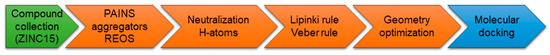 With the intention of identifying compounds that prevent the SARS-CoV-2 spike protein from binding to NRP1, a subset of the available compounds from the ZINC15 [47] library was prepared and screened against the CendR binding site on the NRP1 b1 domain. Library preparation (Figure 3) was performed in order to filter out structural faults, eliminate known and predicted aggregators, allow elements: H, C, N, O, F, S, Cl, Br, I, P, filter for pains (pan-assay interference compounds) [48,49] and REOS (rapid elimination of swill) structures to eliminate reactive and labile functional groups as well as to apply Lipinski [50] and Veber [51] medicinal chemistry filters. Therefore, KNIME software with RDKit software nodes was used to compare all structures in the library to the selection of SMARTS-formatted flags and to remove hits from the database [52].