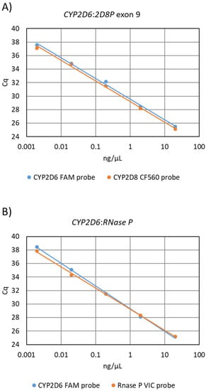 The equal affinity of the primers for both gene targets, and the efficiency of the PCR assay, was investigated by comparing a standard curve to that from the reference assay (Figure 1). The obtained slope values for the CYP2D6:2D8P assay where −3.39 for the CYP2D6 probe and −3.37 for the CYP2D8P, resulting in a calculated PCR efficiency of 97.3% and 97.9% (Figure 1A). The same analysis for the reference CYP2D6:RNase P assay gave a slope of −3.18 and −3.40, respectively, and a calculated efficiency of 105.4% and 96.9% (Figure 1B).