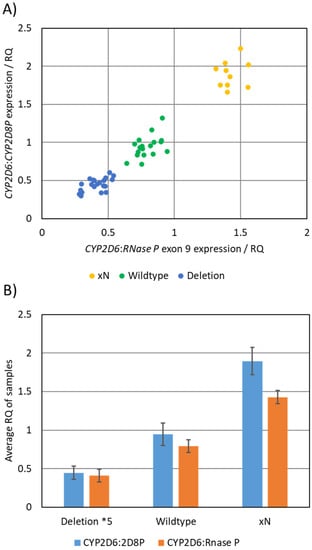 Comparison between the CYP2D6:2D8P singleplex, and the CYP2D6:RNase P reference assay. (A) Graphical representation of results obtained by parallel testing, where the calculated RQ values obtained from the two assays are plotted against each other. The plot separated the samples into three groups based on the copy number of the sample. (B) Calculated average RQ value for the samples carrying deletion *5 (n = 20), wildtype (n = 18), and duplications (n = 10).
