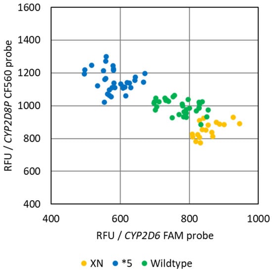 Common end-point PCR allele discrimination plot of the reference samples obtained by the singleplex CYP2D6:2D8P assay. The plot shows the differentiation into the three genotype groups, deletions *5, wildtype, and samples with one or more duplicates of the CYP2D6 gene (xN).
