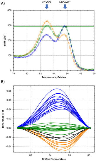 Detection of CYP2D6 deletions or duplications by high-resolution melting PCR. (A) Melt curve showing the proportional change between the two amplicons generated from the CYP2D6 and the CYP2D8P gene, identified by the two arrows. (B) Temperature shifted view of the melt curves from all of the reference samples (n = 48) used for the validation of the assay. Clustering was done by automatic calling, using the Precision Melt software from Bio-Rad. Blue = deletions *5, green = wildtype, orange = duplications, and black = unresolved duplicate samples.
