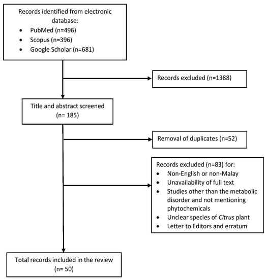 A literature search was conducted in three electronic databases which were PubMed, Scopus and Google Scholar by using the following sets of search terms: “Citrus hystrix” OR “kaffir lime” AND “metabolic disorder” OR “metabolic syndrome” OR “hyperlipidemia” OR “hypertension” OR “diabetes” OR “obesity” OR “pharmacokinetics” OR “toxicity” OR “ethnobotanical” OR “medicinal use” OR “bioactive compound” OR “phytochemical”. Original articles and reviews published in English or Malay were included in this review. Articles published in other languages, not available full-text, studies with unclear Citrus species, and studies other than the metabolic disorder were excluded. Based on the inclusion and exclusion criteria, fifty articles were finally included in the review (Figure 2).
