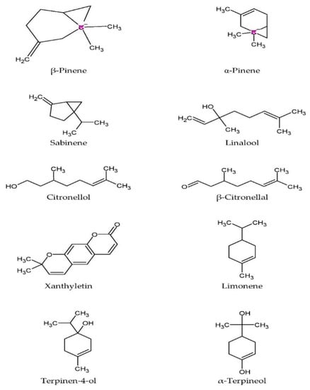 Essential oils extracted from the twigs and leaves contain monoterpenes like citronellal, citronellol, linalool, sabinene, and limonene [,,,], while the major compounds in the oil from the rind are β-pinene, sabinene, limonene, citronellal, α-pinene, and terpinen-4-ol []. The oil from the leaves was noted to be inactive against Staphylococcus aureus, Staphylococcus epidermidis, Bacillus subtilis, Escherichia coli, and Klebsiella pneumoniae, but was moderately effective in inhibiting the fungal growth of Candida albicans, Saccharomyces cerevisiae, and Cryptococcus neoformans []. The antifungal activity of the leaf oil could be attributable to the presence of oxygenated monoterpenes []. Figure 3 shows the chemical structure of major phytochemical compounds found in the plant.
