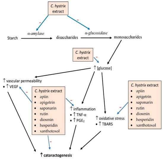 To the best of our knowledge, only a study had investigated in vivo effects of C. hystrix extract. Drinking 150 or 300 mg/kg body weight of C. hystrix leaf extract in solution with water lowered fasting blood glucose in streptozotocin-induced diabetic rats []. The beneficial effects of the extract led to a significant reduction in the incidence of cataracts in the rats, a phenomenon which was believed to be associated with reductions in oxidative stress and inflammation, indicated by lower levels of malondialdehyde, prostaglandin E2, and tumor necrosis factor-α (TNF-α); attenuated vascular permeability was also observed due to decreased levels of vascular endothelial growth factor. In the study, bioactive compounds were identified in the extract, namely apiin, apigetrin, saponarin, rutin, diosmin, hesperidin, and xanthotoxol []. These compounds have been shown to possess anti-inflammatory and antioxidant activity [,,,]. Further studies should be conducted to confirm the potential antidiabetic effects of the compounds in vivo as well as their mechanisms of action. The effects of the compounds on poly (ADP-ribose) polymerase and aldose reductase activity in the lens should be investigated as these enzymes are elevated in diabetic cataracts [,].