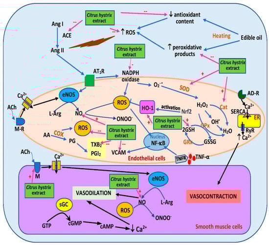 The antihypertensive effects of the extract were further investigated via incorporation into rat diet [,]. Intake of a five-time-heated oil diet supplemented with 0.15% C. hystrix leaf extract for 16 weeks decreased systolic blood pressure in rats when compared with the unsupplemented group []. Reduced plasma TBARS, reduced serum ACE, and elevated serum heme oxygense-1 (HO-1) were also reported in the supplemented group []. HO-1 activation promotes vasodilation and diminishes oxidative stress []. Aortic rings obtained from the group also demonstrated reduced response to phenylephrine-induced vasoconstriction []. The beneficial effect on vasoconstriction was likely attributable to increased plasma NO level [] and reduced plasma thromboxane B2 (a vasoconstrictor) [] (Figure 5). The diet also preserved aortic histomorphometry, specifically intima–media area, intima–media thickness, and circumferential wall tension []. However, similar effects except for HO-1 were not observed in the group given ten-time-heated oil supplemented with the extract [,]. The extract did not affect plasma prostacyclin levels [] and aortic response towards vasorelaxation triggered by acetylcholine and sodium nitroprusside []. The findings of the studies suggest that C. hystrix leaf extract supplementation promotes vasorelaxation by restoring the vasodilative properties and structure of blood vessels, likely via its antioxidant properties. The extract may also exert its effects via β- and α-adrenoceptor blockade, which should be further studied. Unfortunately, no clinical study was performed to confirm the effects seen in the animals. The effect of the extract on calcium handling proteins like sarcoplasmic/endoplasmic reticulum Ca2+ ATPase (SERCA), Na+/Ca2+ exchanger, L-type calcium channels, and ryanodine receptor 2 (RyR2) should be explored because intracellular calcium regulation is an important mechanism in vasoconstriction []. Other signaling pathways including the asymmetric dimethylarginine-NO (ADMA/NO) and RhoA/Rho kinase pathway, which mediates calcium sensitization, should be studied as well. ADMA is an inhibitor of NO synthesis [].