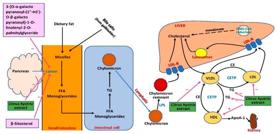 Collectively, the effects of C. hystrix on serum blood lipids were not conclusive due to the unestablished models used in the studies. However, possible sites of action of C. hystrix extracts are summarized in Figure 6. More studies should be conducted using well-established models and appropriate experimental design, and possible mechanisms of blood lipid profile improvement should be elucidated. The effect of the extract on proteins involved in lipid metabolism and transport such as 3-hydroxy-3-methyl-glutaryl-coenzyme A reductase (HMG-CoA reductase), lecithin cholesterol acyltransferase, lipoprotein lipase cholesteryl ester transfer protein, and LDL receptor regulation should also be investigated. The effect of the extract on fatty acid oxidation mediated by peroxisome proliferator-activated receptors (PPARs) or possible inhibition of intestinal absorption of cholesterol should also be explored. In terms of its potential as an anti-obesity drug, the effects of the extract on lipid homeostasis should be investigated further. Lipogenesis-related proteins and genes including acetyl-CoA carboxylase 1 (ACC1), sterol regulatory element binding protein-1c (SREBP-1c), and fatty acid synthase (FASN) can be measured in white fat and liver. The effect of the extract on lipolysis can also be examined by analyzing the expression of hormone-sensitive lipase (HSL), adipose triglyceride lipase (ATGL), lipoprotein lipase (LPL), and β-oxidation-associated genes and proteins in the involved organs. Therefore, the extract and its phytochemical compounds have the potential to be developed as targeted therapies for obesity.