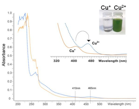 UV-Vis spectra for copper(I) complex 1c registered after 0 h (dotted line, transparent colorless solution) and 12 h (solid line, green solution).