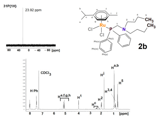 All phosphines Ph2PCH2N(CH2CH3)2 (1), Ph2PCH2N(CH2CH2CH2CH3)2 (2), and Ir(III) (1a, 2a); Ru(II) (1b, 2b) and Cu(I) (1c, 2c) complexes were precisely characterized by 1D NMR techniques (1H NMR, 31P{1H} NMR) (Figure 2, Table S1, Figures S1–S9, Supplementary Material), and mass spectrometry (Figures S10–S23, Supplementary Material). The application of these techniques allowed determining the structures of the complexes in solution under atmospheric oxygen.
