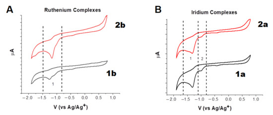 Furthermore, cyclic voltammetry (CV) was studied to precisely understand the re-dox activity of the studied complexes (i.e., ROS production, vide supra). Both iridium(III) and ruthenium(II) complexes manifest a similar electrochemical behavior, irrespective of the different substituents of the amine group (Figure 3). The cyclic voltammetry of all these mononuclear complexes, independently of the nature of the metal, reveal a main irreversible reductive wave centered at ca. −1.3 V vs. Ag/Ag+, which is the envelope of several irreversible processes beginning at ca. −0.8 V vs. Ag/Ag+, and are thus assigned to the phosphine ligand electro activity. In the case of the iridium complexes, and differently from the Ru(II) compounds herein considered, a comparatively small irreversible wave centered at about −1.0 V vs. Ag/Ag+, (peak 2 in Figure 1, left) separated well from the main peak at −1.3 V vs. Ag/Ag+ (peak 1 in Figure 1, left) is also observed.