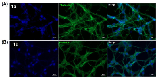 Accumulation of (A) Ir(III) (1a) and (B) Ru(II) (1b) in A549 cells. Green fluorescence–phalloidin, blue fluorescence-tested compounds.