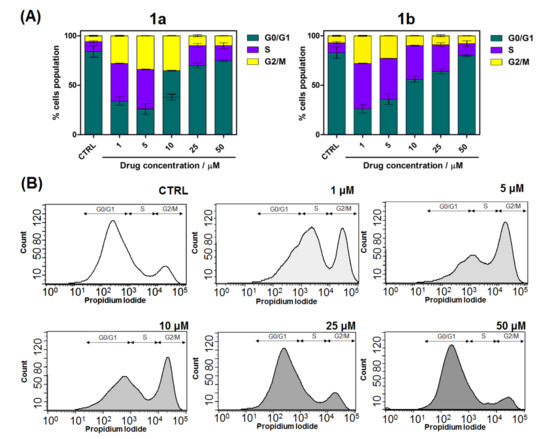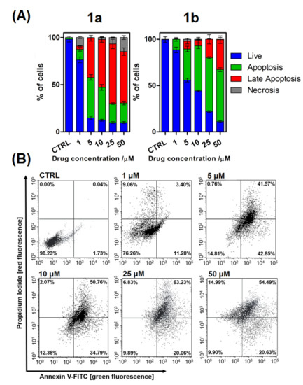 Analyzing cell death induced by 1b, it can be seen that the analysis revealed that the treatment with each concentration resulted in more percentages of early apoptotic cells. After the treatment with a high concentration (50 μM), more late-apoptotic cells can be observed (30%). Nevertheless, there is significantly less population than after treatment with 1a, where the late apoptosis is a major mechanism of death (up to 55% of AnnexinV-FITC-positive and PI-positive cells). Interestingly, almost no cells that died via the necrotic pathway may be detected. The increase in concentration accompanied by the extent of apoptosis seems to be favorable because agents that induce apoptosis directly would overcome many of the problems observed with existing drugs and, as a result, have great therapeutic potential. Apoptosis is preferable to necrosis since it is a particularly efficient mode of cell death that does not produce inflammation and damage to the surrounding normal tissue. Moreover, agents that induce apoptosis directly should be less mutagenic than existing drugs and, because they engage the program further downstream, be less prone to resistance [65].