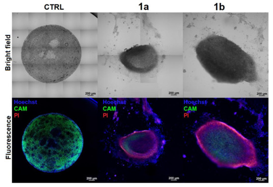 Three-dimensional culturing in vitro: For hanging drop formation, the lid from a tissue culture dish was removed and 5 × 105 CT-26 or A549 cells in 10 μL drops were placed on the bottom of the lid. In each case, the cell suspension was homogeneous and did not contain aggregates, since it determines the size and uniformity of spheroids. Then, the lid was inverted onto the PBS-filled bottom chamber. The cells were cultured in incubators maintained at 37 °C with 5% CO2 under fully humidified conditions. Once sheets were formed, they were transferred to 96-well plates coated with Geltrex matrix and incubated with a complete growth medium until spheroids were created. The direct effect of compound toxicity was examined on spheroids derived from both CT-26 and A549 cell lines. Twenty-four hours after treatment, the spheroids were stained with Hoechst33342, calcein AM (CAM), and propidium iodide (PI) to estimate the live/dead cells population for one hour, washed, and visualized under a Zeiss LSM 880 confocal microscope (Carl Zeiss, Jena, Germany) with a 63× immersion objective. Images were analyzed by Zeiss ZEN Software.