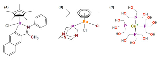 Schematic view of the (A) half-sandwich” Schiff-base Ir(III); (B) RAPTA-C; (C) [Cu(tris(hydroxymethyl)phosphine)4][PF6].