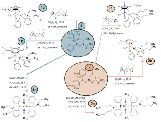 All syntheses were carried out under an atmosphere of dry oxygen-free dinitrogen, using standard Schlenk techniques or a glove box. The ligands Ph2PCH2(CH2CH3)2 (1) and Ph2PCH2(CH2CH2CH2CH3)2 (2) (Scheme 2) are extremely sensitive and all reaction were performed in nitrogen atmosphere. Synthetic routes of iridium(III) complexes: Ir(η5-Cp*)Cl2Ph2PCH2(CH2CH3)2 (1a), Ir(η5-Cp*)Cl2Ph2PCH2(CH2CH2CH2CH3)2 (2a) (Cp*: pentamethylcyclopentadienyl); ruthenium(II) complexes: Ru(η6-p-cymene)Cl2 Ph2PCH2(CH2CH3)2 (1b), Ru(η6-p-cymene)Cl2Ph2PCH2(CH2CH2CH2CH3)2 (2b) and copper(I) complexes: [Cu(CH3CN)2(Ph2PCH2(CH2CH3)2)2] (1c), [Cu(CH3CN)2(Ph2PCH2(CH2CH3CH3CH3)2)2] (2c) are presented in Scheme 3.