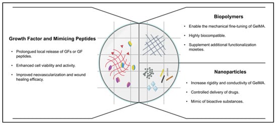 In general, GelMA provides a structure similar to the ECM for cells to proliferate. However, besides the basic requirement like a substrate for cell attachment, the supplemental composition should also be considered to provide an optimal environment for different cell types. Inorganic materials can add minerals to GelMA to better resemble natural ECM [121]. A series of inorganic materials such as hydroxyapatite (HAp) or bioglass, silicate, ceramics, or other porous nanoparticles have been used to modify GelMA.