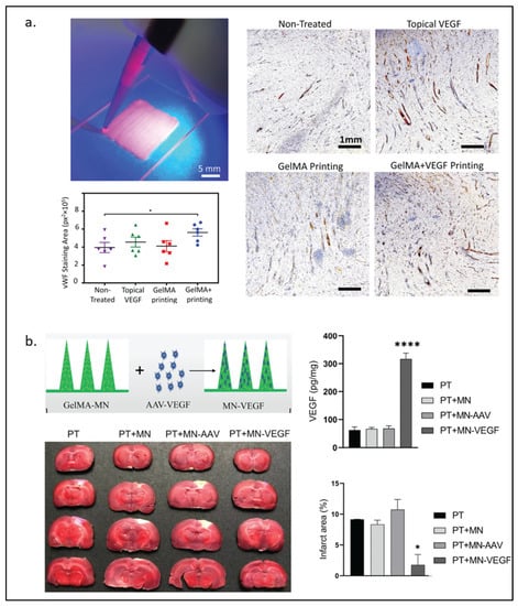 VEGF-modified GelMA hydrogel. (a) Handheld printing using VEGF-modified GelMA hydrogel as bioink for wound healing (left) and immunostained for von Willebrand Factor under an optical microscope (right) with quantitative results of wound bed angiogenesis by measurement of vWF signal in different wounds (n = 6). The data is presented as mean ± standard error of mean (SEM). Comparison of the different groups was performed using a student’s T test and * represents p < 0.0005 (bottom left). (b) Schematic illustration of GelMA-microneedles loaded with AAV-VEGF and the results of cerebral ischemia treatment in rats among different groups treated. (Photothrombotic (PT), microneedle (MN), adeno-associated virus (AAV), vascular endothelial growth factor loaded microneedle (MN-VEGF)). Statistical analysis was performed using a two-sided Student’s t-test or one-way analysis of variance (ANOVA). of the infarct area (upper right) and the protein levels of VEGF in the brain 3 weeks after MN implantation (lower right). The data are expressed as the mean ± SD. * p < 0.05 and **** p < 0.0001. Reproduced (adapted) with permission from Ref. [23]. 2022 © Biomaterials, and from Ref. [27]. 2021 © Journal of Controlled Release.