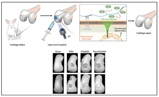 A schematic illustration of a novel photo-crosslinked GelMA hydrogel and HSNGLPL-MA recruits endogenous TGF-β1 and enhances cartilage regeneration. A 3D reconstruction of micro-computed scans after cartilage repair with GelMA modified with TGF-β1 affine peptides in rabbits. Reproduced (adapted) with permission from Ref. [30]. 2021 © Smart Materials in Medicine.