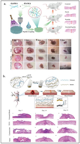 Hyaluronic acid, a type of Glycosaminoglycan (GAG), is an important component of the extracellular matrix (ECM) [105] that has been incorporated into hydrogels in tissue engineering material developments [106,107]. In 2017, Eke and Mangir et al. [33] developed the photo-cross-linkable GelMA and methacrylated hyaluronic acid (HAMA) cell-laden hydrogel for angiogenesis and wound healing purposes. Lee and Park et al. [34] used 3D printing to construct a more complicated structure of a rabbit larynx from GelMA and HAMA. The GelMA-HAMA structure remained stable three weeks after in vivo implantation and induced increased type II collagen expression over time. Recently, Guan et al. [35] covalently attached the novel pro-angiogenic peptide, QHREDGS, onto 3D-printed GelMA-HAMA patches. These patches significantly improved the migration of HDF cells and the tube length formed by HUVECs. As shown in Figure 4a, animal wound healing models also showed the best recovery percentage with the lowest proinflammatory factors expression in the peptide-loaded hydrogel group.