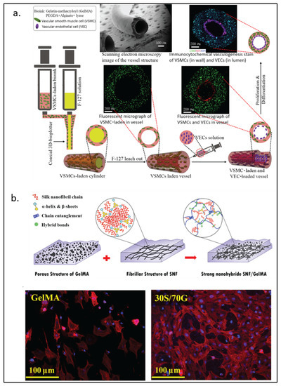 Blood vessels are the primary means to deliver nutrients and oxygen to tissues in the body. Vascular disorders are among the top causes of death worldwide. In the current state of tissue engineering, vascularization remains a primary challenge as blood vessels must be able to withstand a wide range of blood pressures and offer a range of sizes, including small vessels with 1–6mm diameters. Several approaches have been investigated, such as applications of cytokines, genes, or cell differentiation to stimulate vascular formation [131]. Currently, designing a scaffold to guide cells into vascular differentiation is an attractive approach for vascular regeneration. GelMA hydrogels have excellent mechanical properties as vascular scaffolds. However, obtaining a large vascular network that can dive deep into tissue has not been possible. Shao et al. [132] used a co-axial bioprinting method to generate GelMA microfibers. The hydrogel shape resembled a human umbilical cord with human umbilical cord endothelial cells encapsulated in the fiber. The encapsulated cells followed a migration pattern towards the peripheries of the fiber and formed a lumen structure that could potentially be used for other applications.