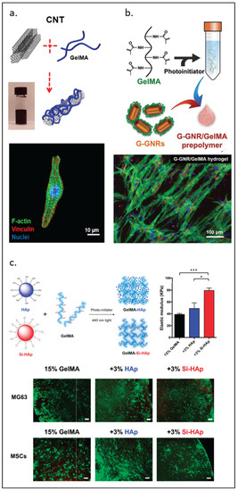 GelMA modified by nanomaterials. (a) Carbon nanotubes. (b) Gold nanorods for cardiomyocyte constructs. (c) Biofabrication of silanized hydroxyapatite modified cell-laden GelMA and MG63 cells and human mesenchymal stem cells (MSCs) encapsulation by GelMA composite (green, calcein AM; red, ethidium homodimer-1). Scale bar, 100 µm. Elastic modulus of GelMA-HAp and GelMA-Si-HAp hydrogels data is presented as mean ± standard deviation. * p < 0.05, *** p < 0.001 upon one-way ANOVA analysis (upper right). Reproduced (adapted) with permission from Ref. [50]. 2019 © ACS Nano. Ref [57]. 2017 © Advanced Functional Materials Smart Materials in Medicine. And Ref. [63]. 2021 © Polymers.