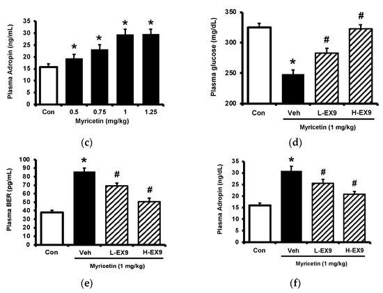Effects of bolus injection of myricetin on plasma parameters in type-1 diabetic rats. (a) plasma levels of glucose, (b) plasma levels of BER, (c) plasma levels of adropine in type-1 diabetic rats receiving myricetin in the indicated concentrations. Blockade of myricetin-induced action by Ex9 regarding the changes in (d) plasma levels of glucose, (e) plasma levels of BER, and (f) plasma levels of adropin in type-1 diabetic rats receiving myricetin treatment. The results in each column are shown as the mean ± SEM (n = 8 per group). * p < 0.05 vs. the diabetic group without any treatment; # p < 0.05 vs. the diabetic group treated with myricetin. Abbreviation: BER, beta-endorphin; Con, control; Veh, vehicle; Ex9, exendin (9–39); L-Ex9, low-dose of exendin (9–39); H-Ex9, high-dose of exendin (9–39).