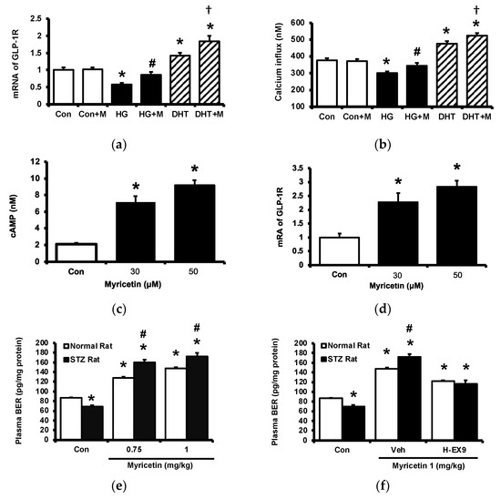The effects of myricetin on cAMP accumulation, the expression of GLP-1 receptors and the palsma BER level in hyperglycemic conditions. Changes of (a) mRNA levels of GLP-1 receptor or (b) intracellular calcium levels in PC12 cell incubated with myricetin (1 μM) for 60 min under the conditions of high glucose or DHT exposure; (c) the changes of cellular cAMP concentrations, and (d) mRNA expression levels of GLP-1 receptor in H9c2 cells receiving myricetin tratment at indicated concentration for 24 h. The effects of myricetin on BER secretion were compared in isolated adrenal medulla. (e) Myricetin dose-dependently increased BER secretion from isolated adrenal medulla tissue of diabetic rats. (f) Ex9, an antagonist of GLP-1 receptor, dose-dependently inhibited the effect of myricetin on BER secretion. The results in each column are shown as the mean ± SEM (n = 8 per group). * p < 0.05 vs. the normal control group without any treatment. # p < 0.05 vs. the normal rats (white column). † p < 0.05 vs. the DHT group. Abbreviation: BER, beta-endorphin; DHT, dihydrotestosterone; Con, control; Veh, vehicle; H-Ex9, high-dose of exendin (9–39).