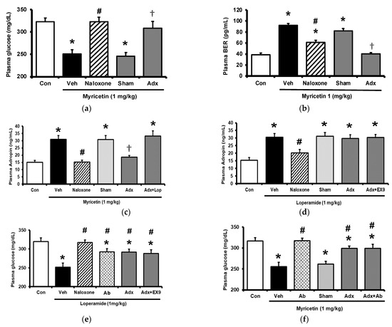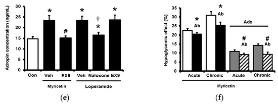 Effects of myricetin in rats receiving adrenalectomy or the treatment of anti-adropin antibodies. (a) The effects of myricetin on (a) blood glucose levels, (b) plasma BER levels in diabetic rats and adrenalectomized rats; (c) plasma levels of adropin in diabetic rats and adrenalectomized rats with or without loperamide treatment; the effect of loperamide on (d) plasma adropin levels, (e) blood glucose levels in diabetic rats with or without naloxone treatment, or the adrenalectomized rats administered with or without Ex9; (f) after the treatment of anti-adropin antibodies, the effects of myricetin on blood glucose levels in diabetic rats receiving adrenalectomy or not. The results in each column are shown as the mean ± SEM (n = 8 per group). * p < 0.05 vs. the diabetic group; # p < 0.05 vs. the diabetic group treated with myricetin or loperamide; † p < 0.05 vs. the sham group. Abbreviation: BER, beta-endorphin; Con, control; Veh, vehicle; Ab, antibody; Adx, adrenalectomy; Ex9, exendin (9–39).