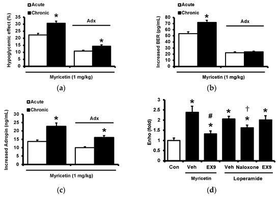 Changes of plasma parameters after acute and chronic treatment of myricetin in type-1 diabetic rats. Myricetin were administered for 4 weeks. The acute and chronic effects of myricetin on (a) the hypoglycemia effect and (b) plasma BER levels, (c) plasma adropin levels have been measured in diabetic rats or diabetic rats receiving adrenalectomy. In HepG2 cells, (d) the expression of Enho gene, and (e) adropin protein levels was promoted by myricetin after incubation for 24 h. Ex9 treatment ameliorated these effects. Furthermore, loperamide increased adropin expression at the mRNA and protein levels. Naloxone inhibited these effects by blocking opioid receptors. (f) Hypoglycemic response to myricetin after chronic treatment in diabetic rats lacking adrenal gland was markedly reversed by adropin antibodies. The results in each column are shown as the mean ± SEM (n = 8 per group). * p < 0.05 vs. the diabetic control group; # p < 0.05 vs. the diabetic group treated with myricetin; † p < 0.05 vs. the diabetic group treated with loperamide. Abbreviation: BER, beta-endorphin; Con, control; Veh, vehicle; Ab, antibody; Adx, adrenalectomy; Ex9, exendin (9–39).